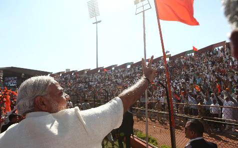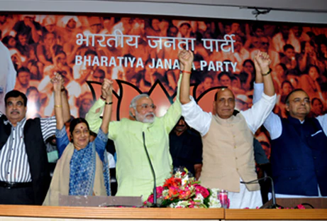 Historic victory for NDA in 2014 Elections. Narendra Modi Tweets, "India has won! भारत की विजय। अच्छे दिन आने वाले हैं।"