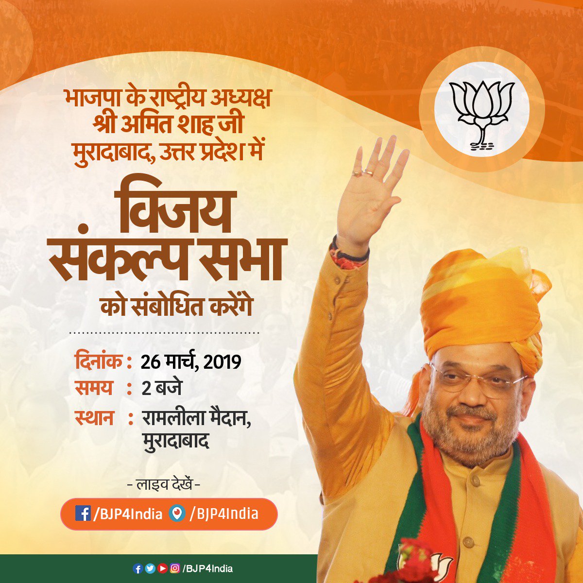भाजपा राष्ट्रीय अध्यक्ष श्री अमित शाह 26 मार्च 2019 को दोपहर 2 बजे मुरादाबाद, उत्तर प्रदेश में 'विजय संकल्प सभा' को सम्बोधित करेंगे।