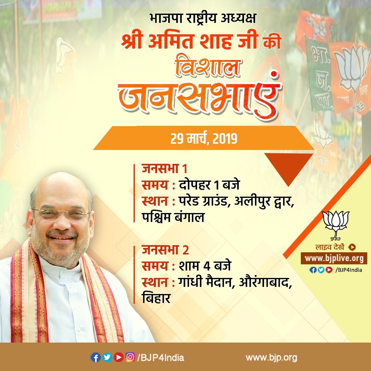 भाजपा राष्ट्रीय अध्यक्ष श्री अमित शाह 29 मार्च 2019 को पश्चिम बंगाल और बिहार में विशाल जनसभाओं को सम्बोधित करेंगे।