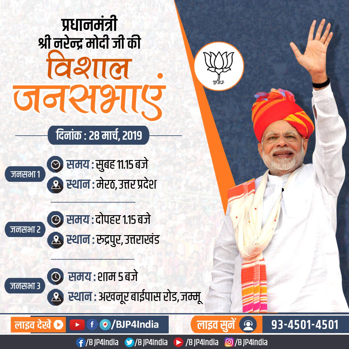 पीएम श्री नरेंद्र मोदी 28 मार्च 2019 को उत्तर प्रदेश, उत्तराखंड और जम्मू में विशाल 'विजय संकल्प रैलियों' को संबोधित करेंगे।