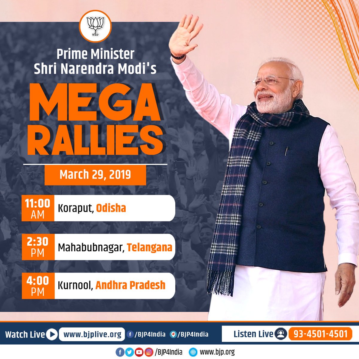 Schedule of Prime Minister Shri Narendra modi’s mega rallies in Odisha, Telangana and Andhra Pradesh on 29 March 2019.